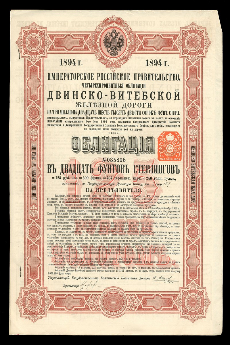 (x) Dvinsk-Vitebsk Railroad 4% bonds, 1894, a group of 193 bonds for 125 roubles, ornate border with Russian arms at top, red and black, with coupons, very fine and extremely fine. (193)