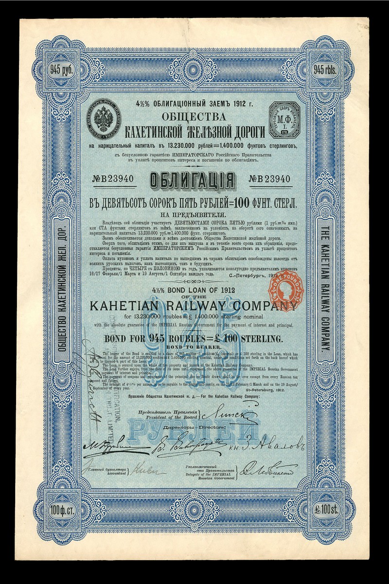 (x) Kahetian Railway Company 4½% loan, 1912, a group of 100 bonds for £100, ornate border, blue, with coupons, mostly extremely fine. (100)
