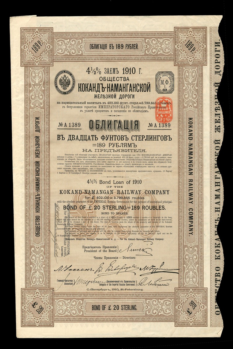 (x) Kokand-Namangan Railway Company 4½% Loan,1910, A group of £20 bonds (97), ornate borders, brown and black with coupons, generally extremely fine. (97)