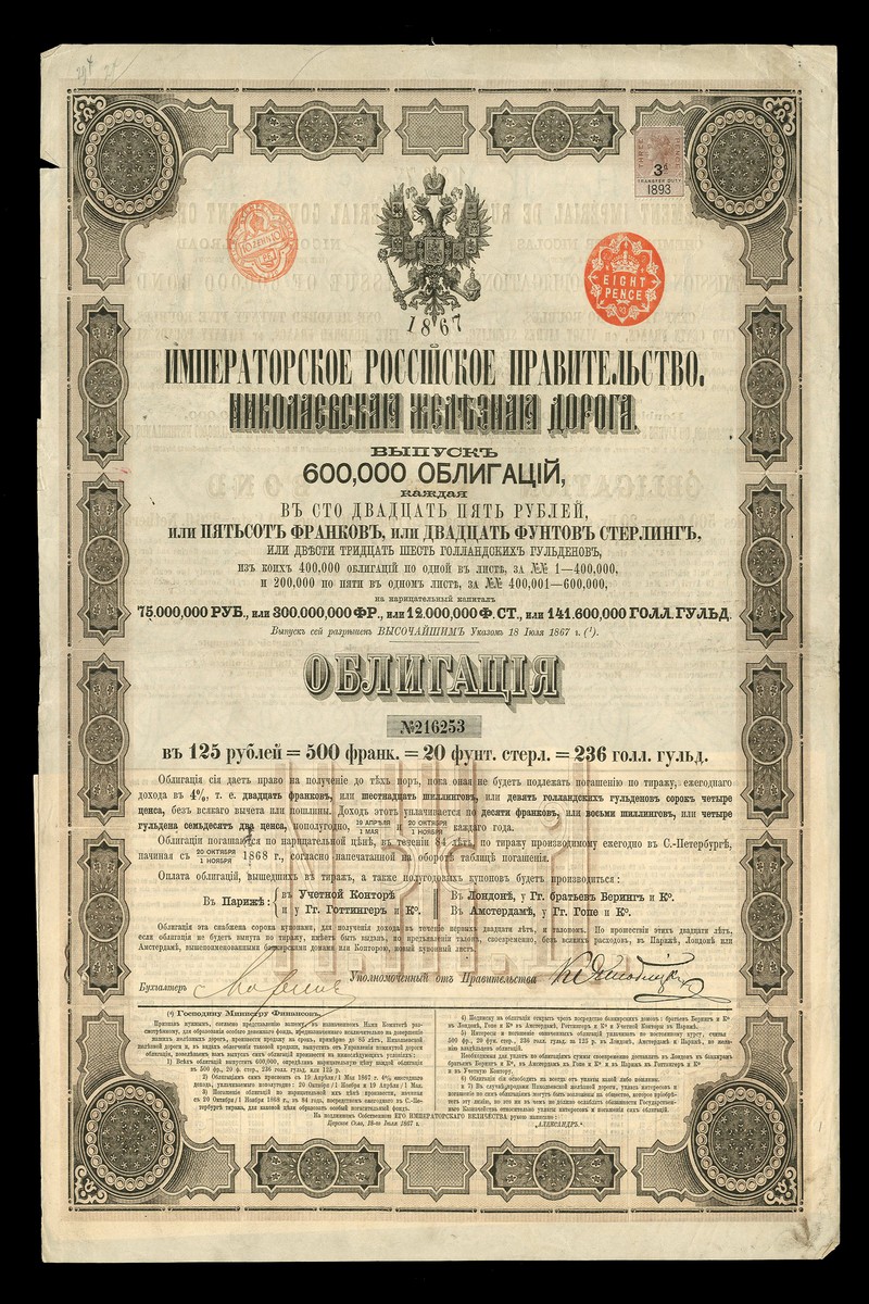 (x) Imperial Government of Russia Nicolas Railroad, 1867, a group of Rbl.125/Frs.500 bonds (111), Imperial coat of arms top centre, black and white with coupons, generally very fine. (111)