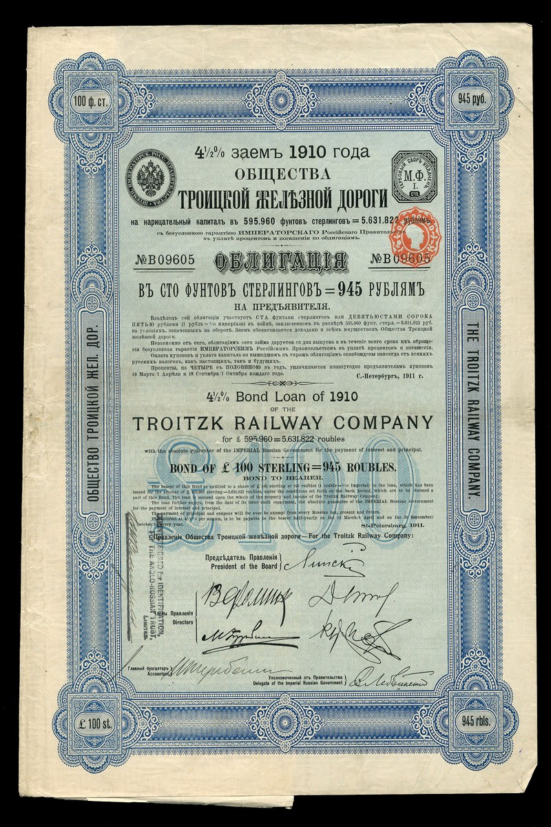 (x) Troitzk Railway Company, 4½% Loan 1910, a group of £100 bonds (48), ornate border, blue, text in English and Russian, coupons, about very fine (48)