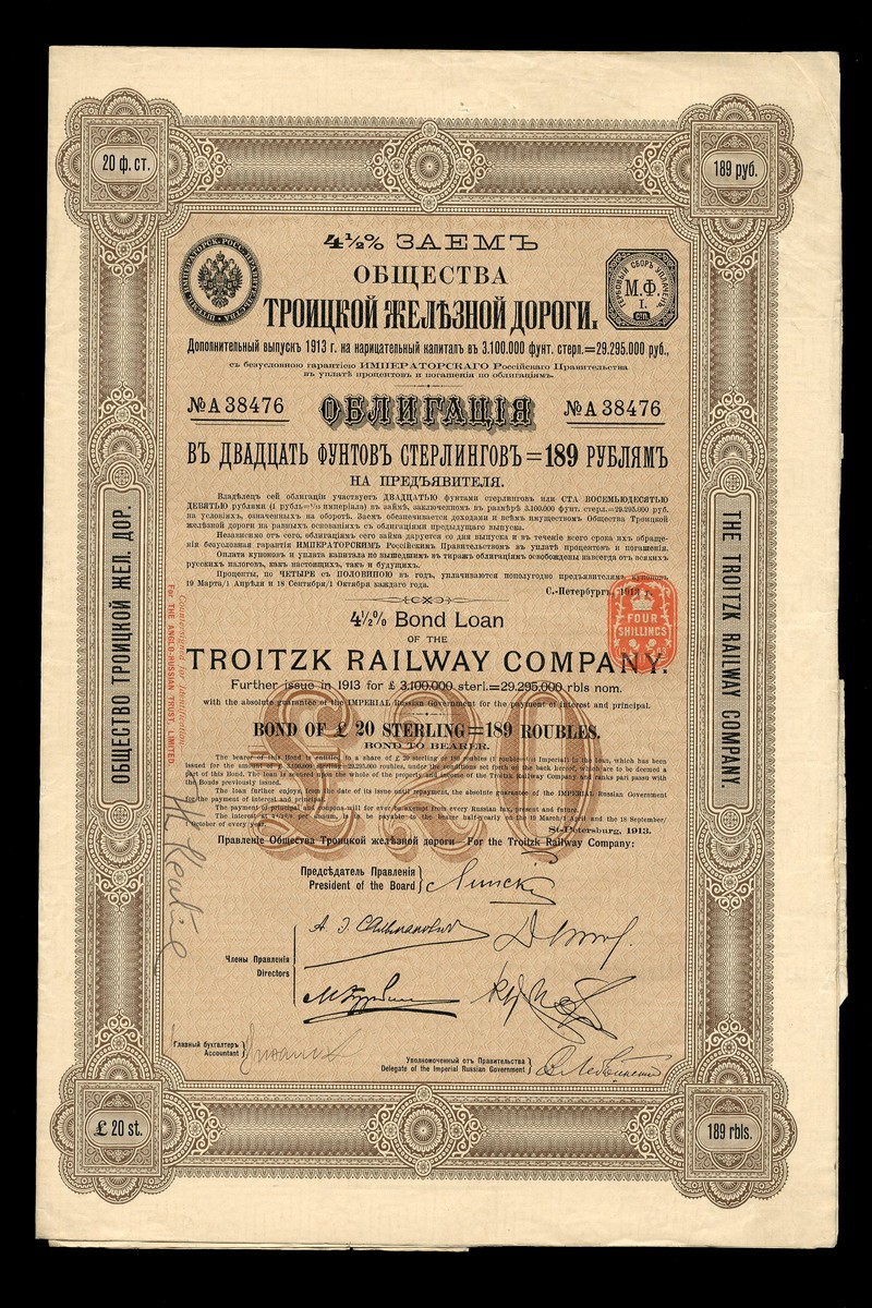 (x) Troitzk Railway Company 4½% Loan 1913, £20 bonds (145), ornate borders, brown, with coupons, about extremely fine (145)