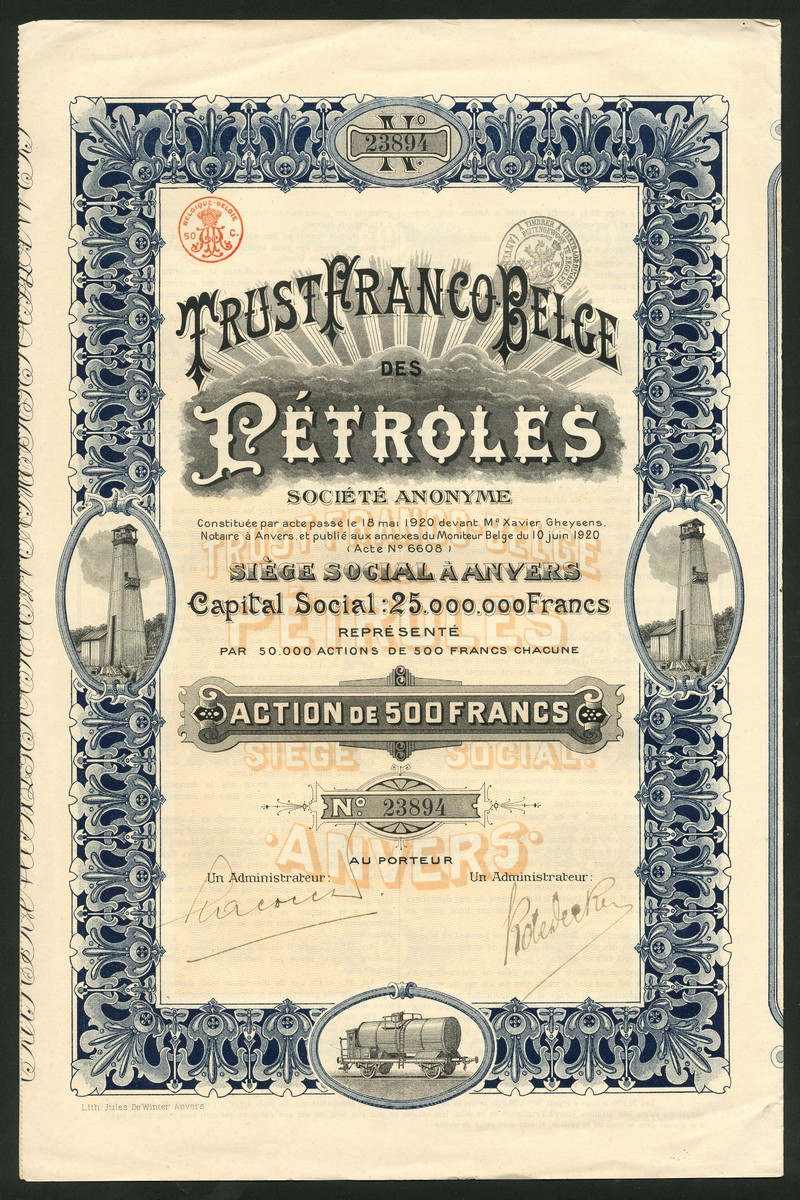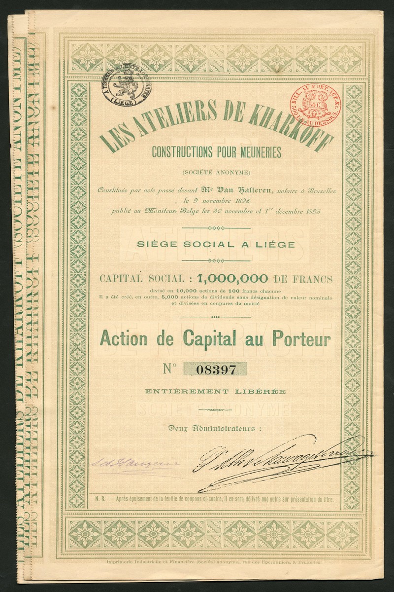 Belgian Companies in Russia; Trust Franco-Belge des Petroles, 500 francs share, 1920 (4), oilwells at left and right, railway wagon at bottom; Emailleries de Lougansk, ordinary share, 1904 (4), and, Les Ateliers de Kharkoff Constructions pour Meuneries, 100 franc shares, 1895 (4), good very fine to extremely fine. (12)