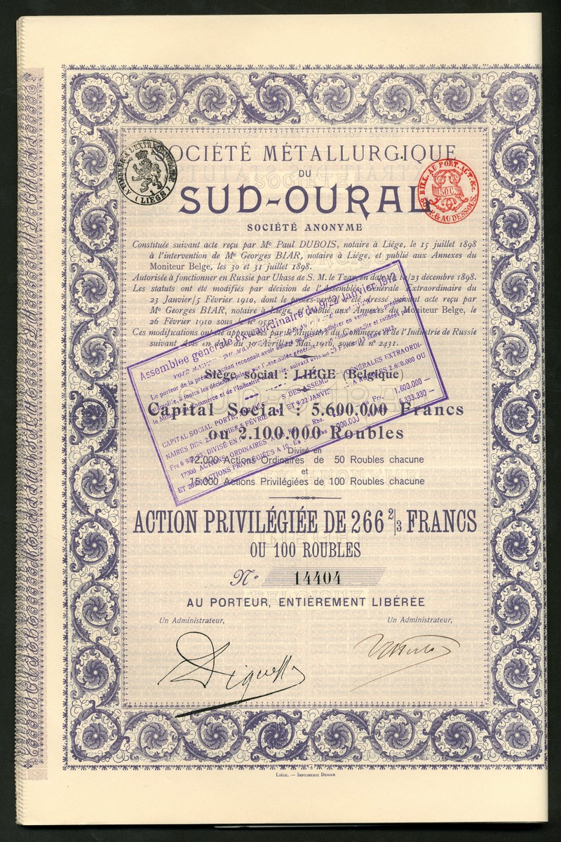 Soc. Métallurgique du Sud-Oural, a group of certificates for 500 franc shares, 1898 (9), preference shares of 266 2/3 francs, 1910 (24) and 500 franc bonds, 1910 (30), all with ornate borders, red , mauve and green respectively, with coupons, generally extremely fine. (63)