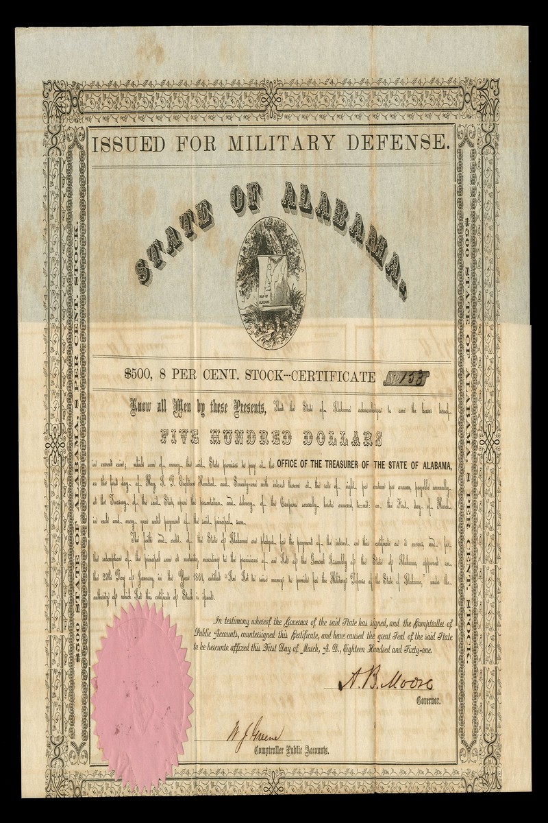 State of Alabama, 8% Loan 'For Military Defense', bond for $500, 1861, no.153, Alabama seal at top, ornate border, black, pink paper seal, with coupons, light toning, good very fine.