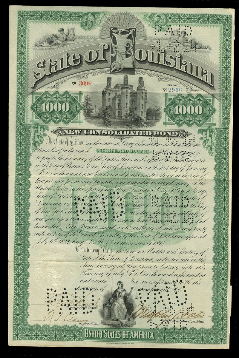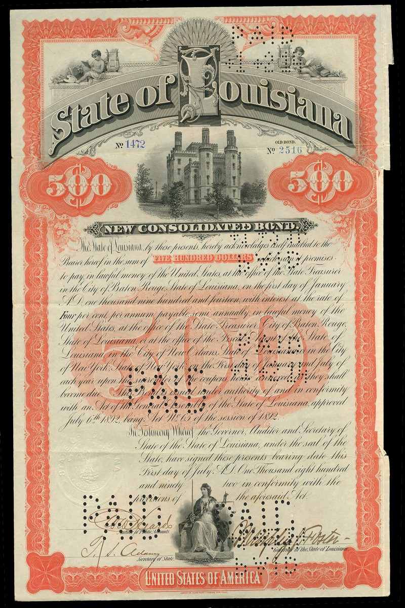 State of Louisiana, 4% Constitutional Bond, $500, 1880, no.100, paddle steamers on river in centre, allegorical figures left and right, black, with coupons, cancelled, together with New Consolidated Bonds, 1892, $100, $500 and $1000 (13), cancelled, fine to very fine. (16)