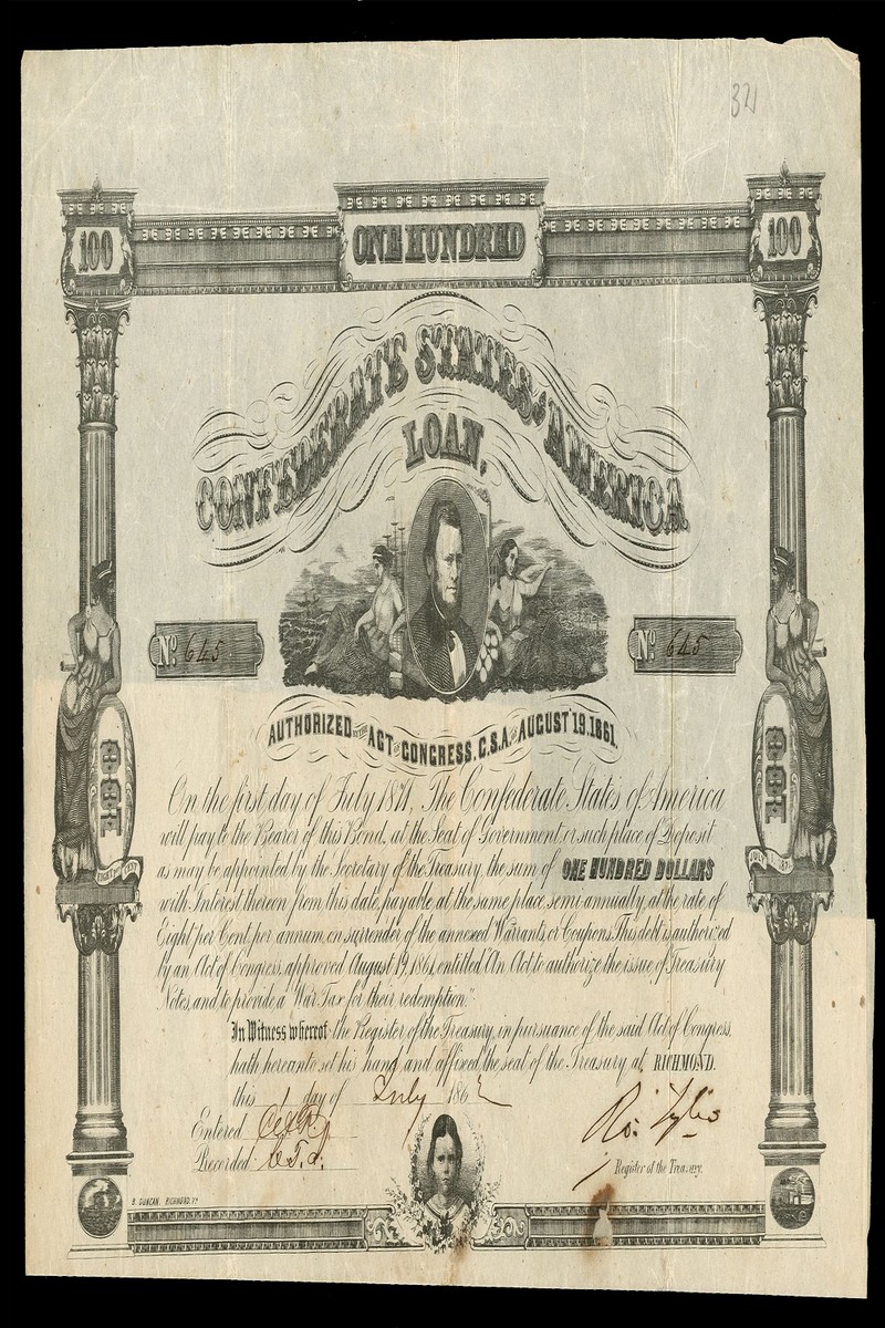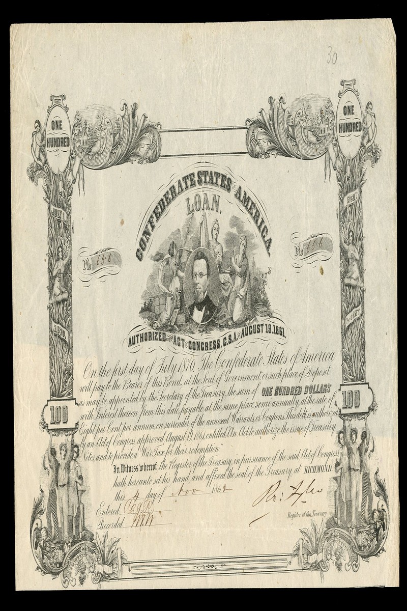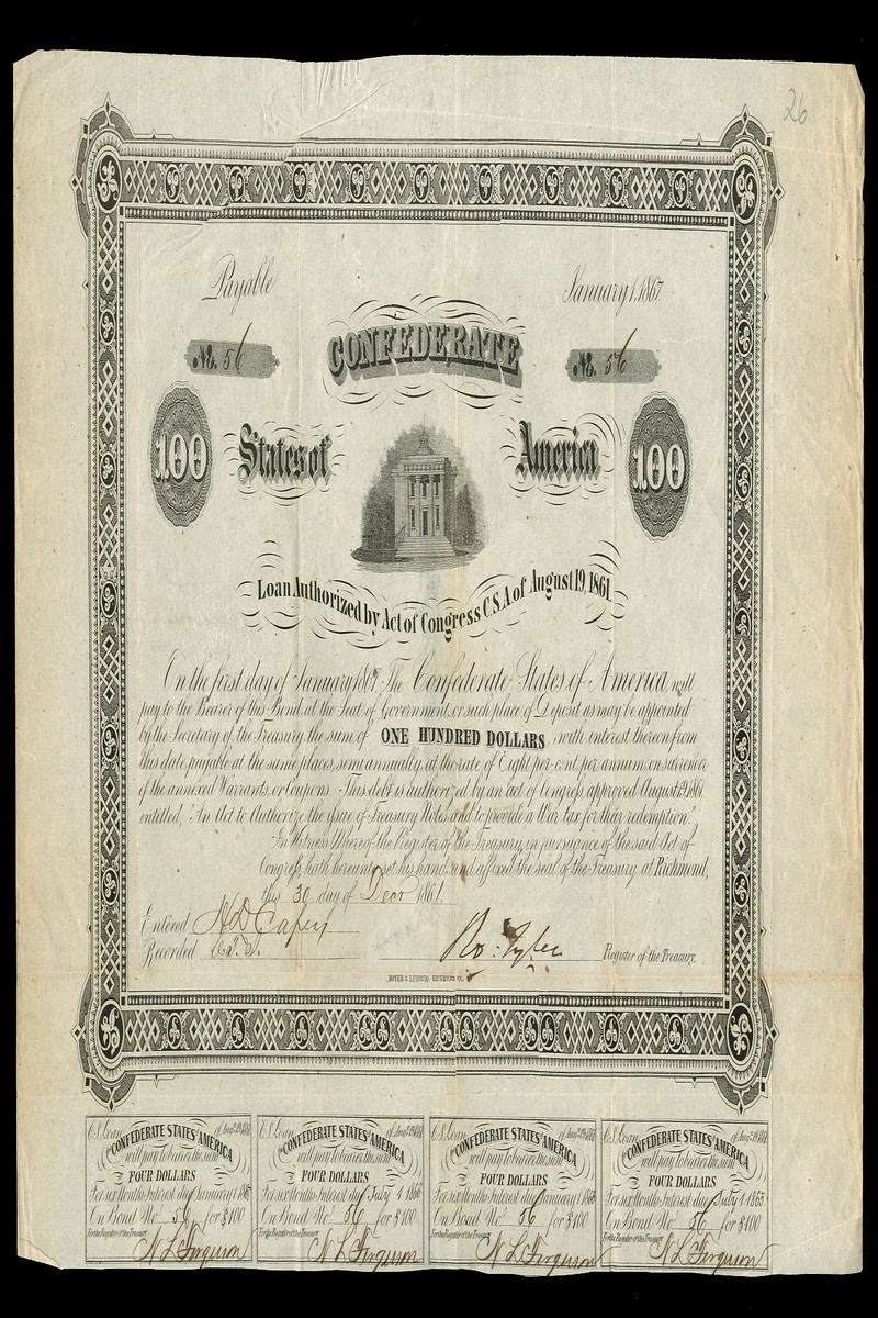 A collection/accumulation of Confederate bonds (14), includes Act of August 19th 1861, $100, redeemable July 1865, vignette of 'Liberty'; $100, redeemable January 1867, vignette of old Richmond Post Office, rare; $100, redeemable July 1870, vignette of T.H.Watts; $100, redeemable July 1871, vignette of Thomas Bragg, and, $100, redeemable July 1872, vignette of S.R.Mallory, minor duplication (Criswell 5, 5A (2), 6, 7, 24, 26, 30, 32, 33, 122, 124, 125, 143B)many fine and better. (14)