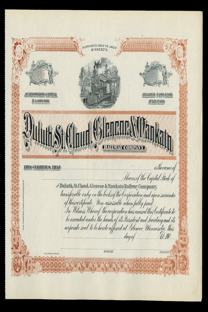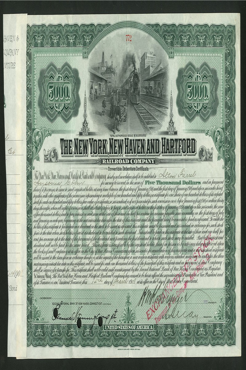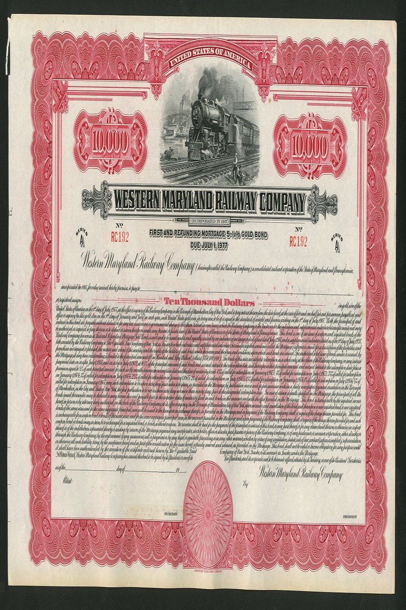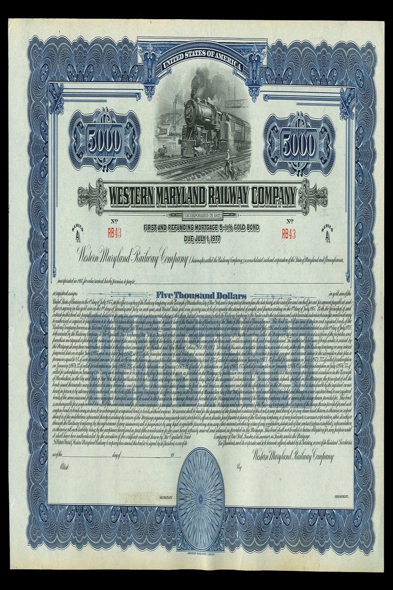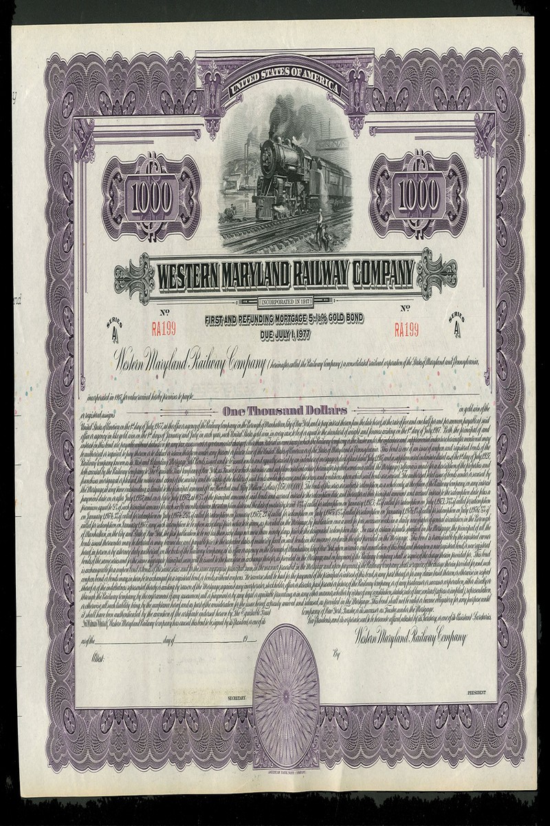 A large collection of American Railroad certificates, including both stock certificates and bonds, some unissued, many dating from the 19th century, a few modern, with some duplication, better pieces noted are Boston, Hartford & Erie, $1000, 1864; Western Maryland RR, $1000, 1868; Northern Pacific Railway, $1000, 1896 and Wilmington & Northern RR, 1877, mixed condition with many cancelled as usual but many are very fine and the unissued generally extremely fine. (198)