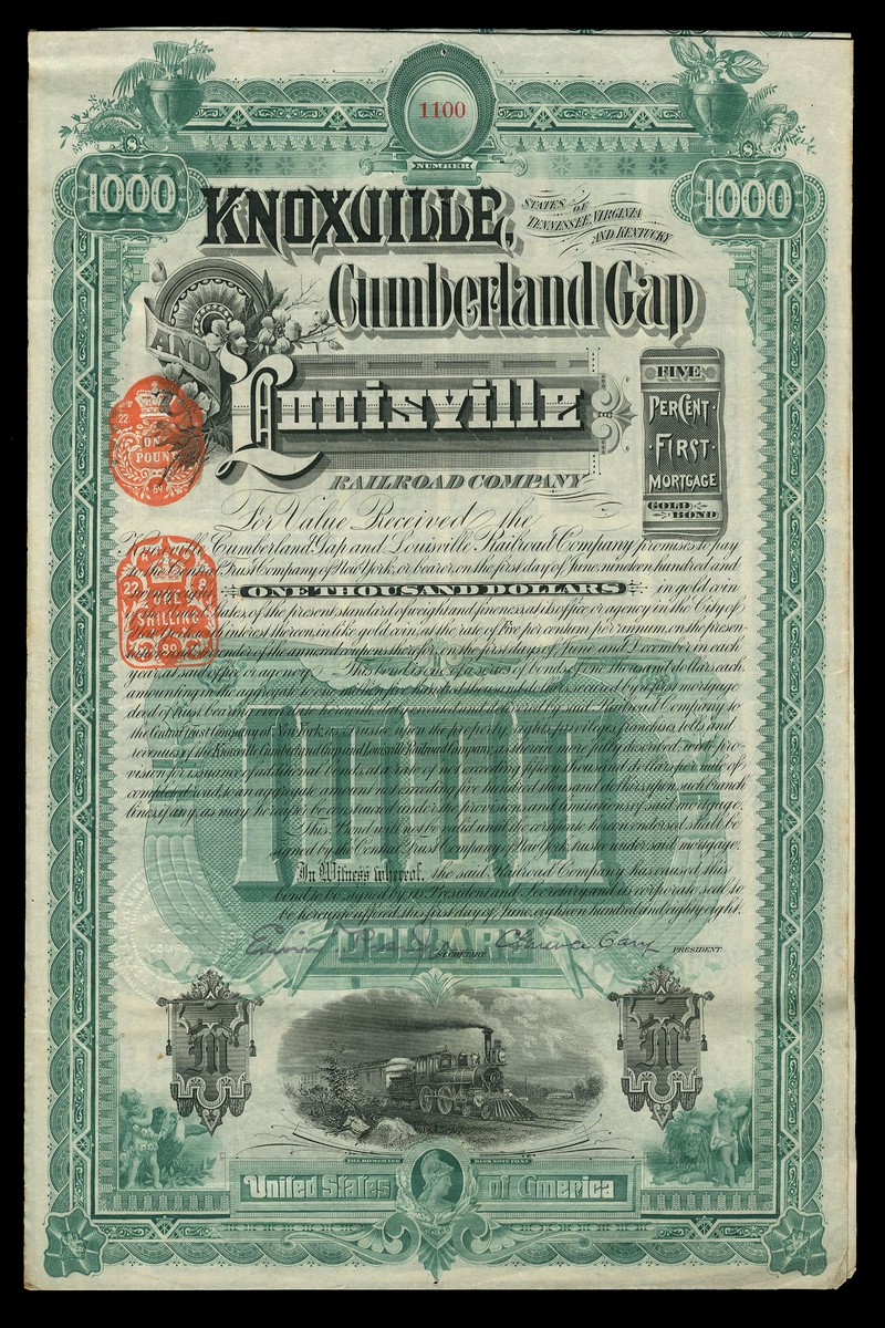 Knoxville, Cumberland Gap and Louisville Railroad Company, 5% first mortgage gold bond for $1000, 1888, no.1100, ornate border, vignette at bottom of steam train, green and black, with coupons, slight creasing, extremely fine.