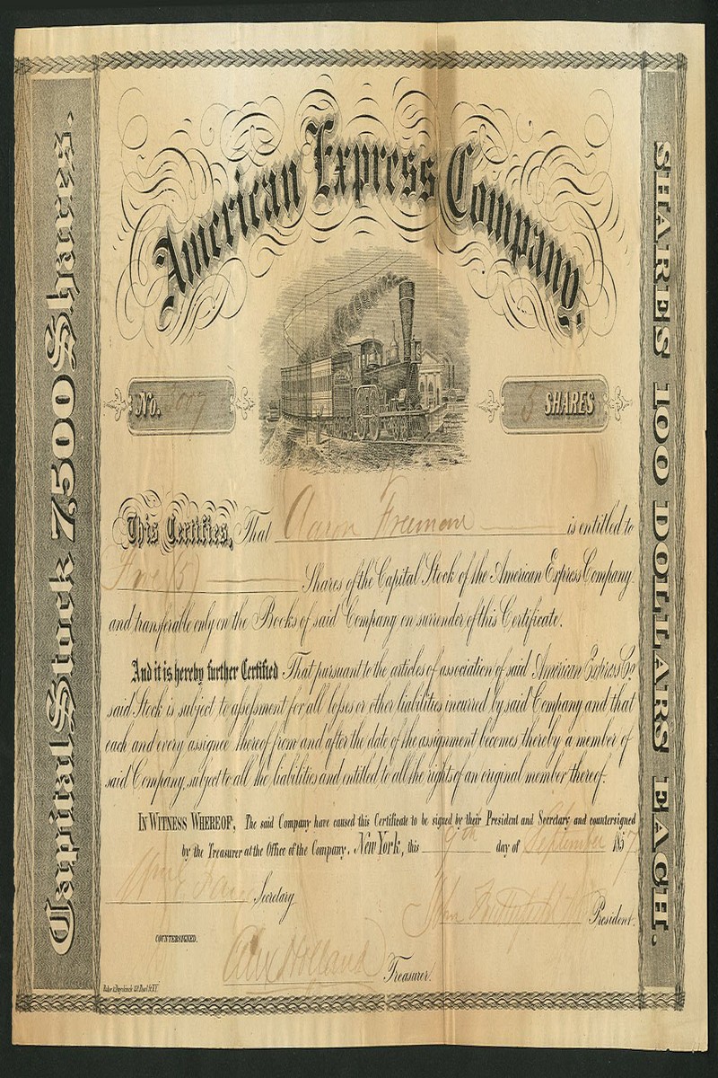 American Express Company, $100 shares, capital 7500 shares, 185[7], no.3007, signed by John Butterfield as President, Alexander Holland as Treasurer and William Fargo as Secretary, vignette of steam train showing two telegraph wires running alongside, black, tape repair at top, usual discolouration but appears not to have any cancellations and a rather nice good very fine example.