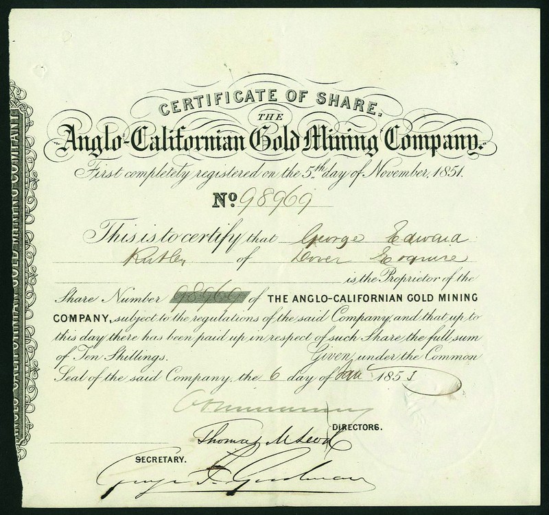 Anglo-Californian Gold Mining Company, a group of 16 certificates for one share, 185[3], scrollwork at left, black, embossed seal, about extremely fine but pinholes at top. (16)