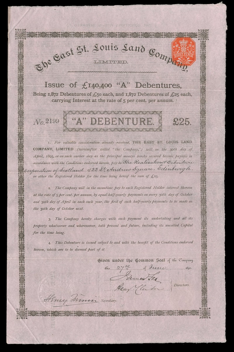 East St.Louis Land Company Ltd, a group of 20 debentures for £25, 1892, ornate border, black on pink paper, red revenue stamp at top, all extremely fine. (20)
