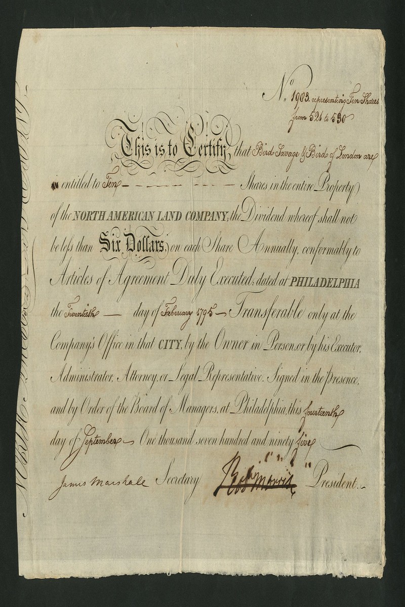 North American Land Company, certificate for shares of 6 dollars, Philadelphia 179[5], no.1903, signed by Robert Morris as president, signature has some ink damage and has been cancelled with a single strike through line, black print on buff, slight ink burning, otherwise extremely fine.