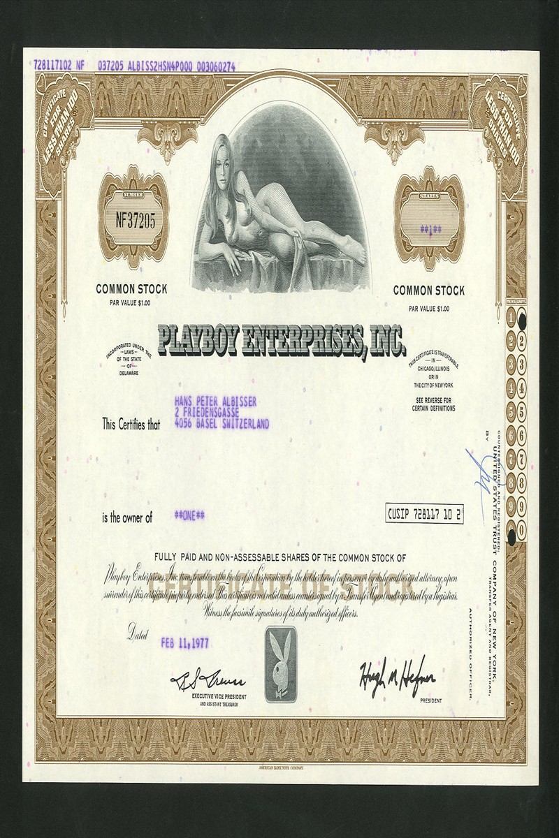 Playboy Enterprises Inc, 1 dollar share, 1977, no.37205, ornate border and vignette of nude playboy model at top, logo at bottom and facsimile signature of Hugh M Hefner in bottom corner, brown, black, extremely fine.