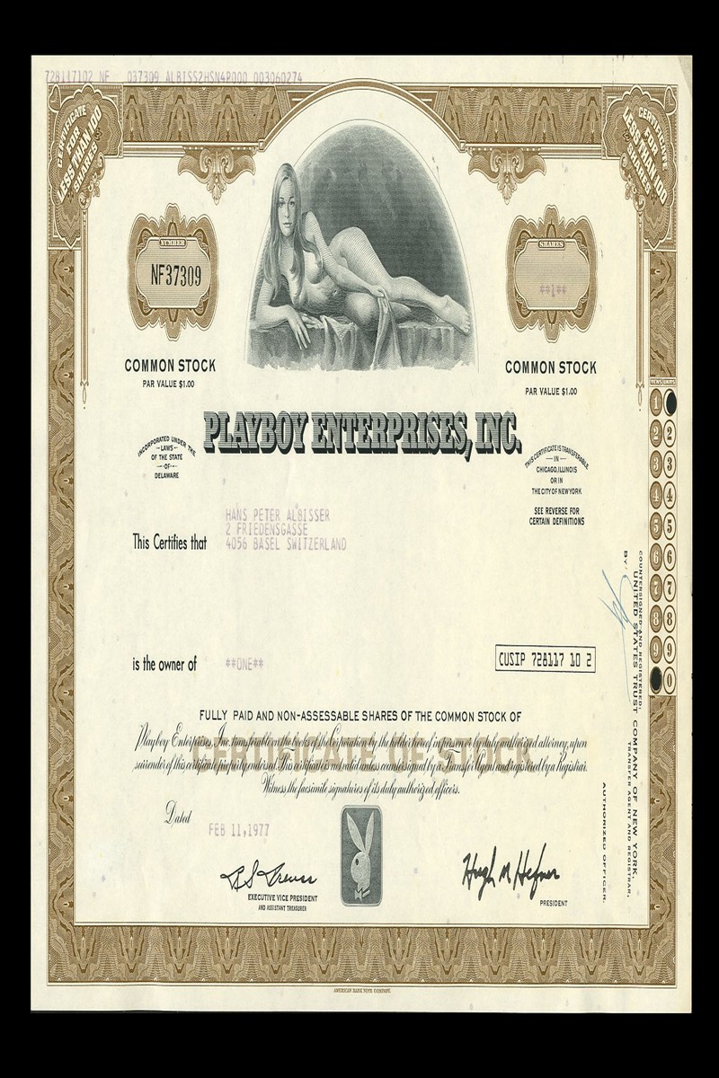 Playboy Enterprises Inc, 1 dollar share, 1977, no.37309, ornate border and vignette of nude playboy model at top, logo at bottom and facsimile signature of Hugh M Hefner in bottom corner, brown, black, extremely fine.