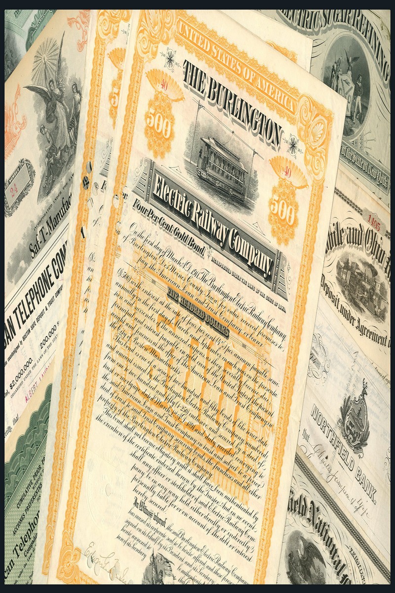 A miscellaneous collection of American certificates (73), including Burlington Electric Railway Company, $500 bonds, 1891 (2), lovely vignette of electric street car; Northfield Bank, 1854 and 1879; Electric Sugar Refining Company, 1887, scarce, and Gila Copper Sulphide Company, $100 bonds (2), a little duplication, a few modern, many very fine. (73)