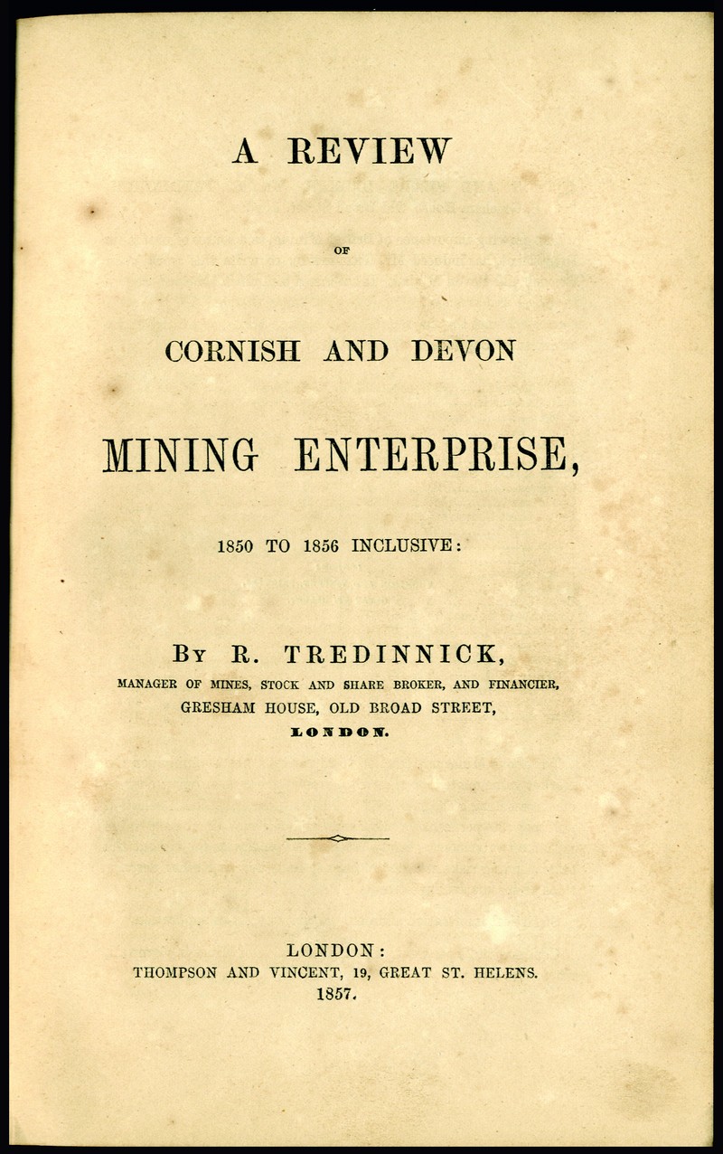 Treddinick was a stockbroker with offices at 8 Gresham House, Old Broad St. This is an extensive survey of the Cornish and Devon mines with his recommendations.