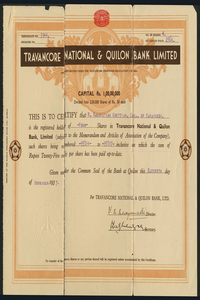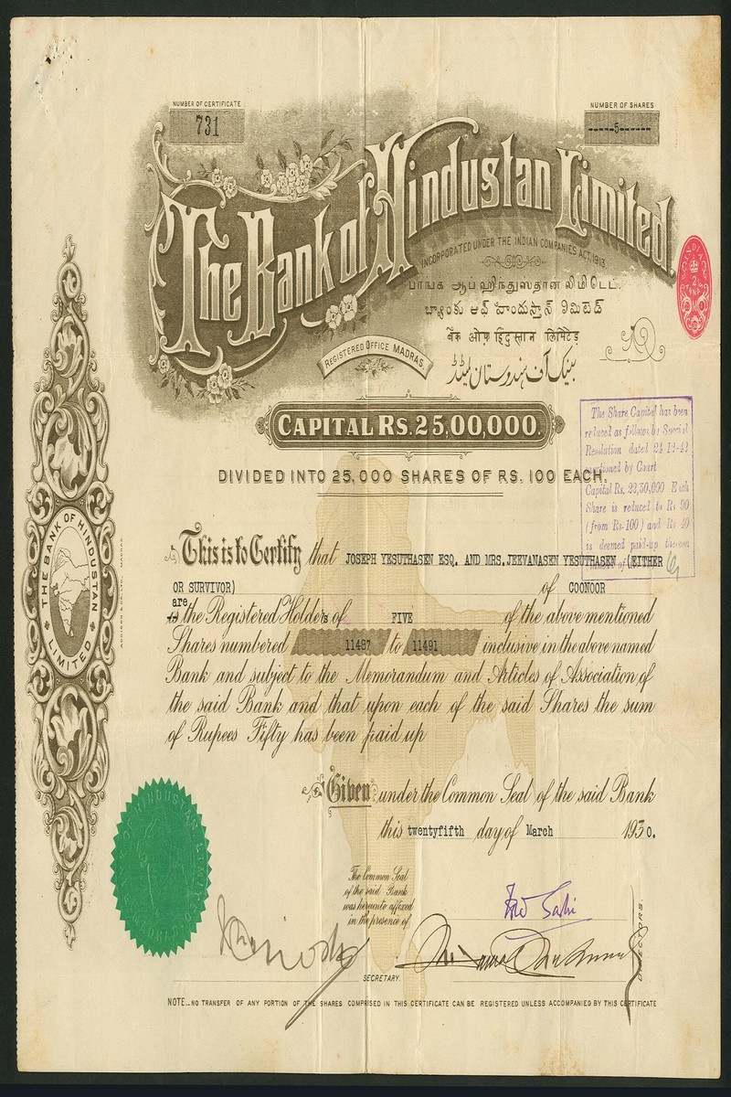 (x) Bank of Hindustan Ltd., 100 rupee shares, 193[0], no.731, attractive piece with underprint map of India, scrollwork at left, brown, green seal, together with Travancore National & Quilon Bank Ltd., 50 rupee shares, 193[7], no.3144, brown and orange-brown with elephants at top centre, the last separated at folds, fine to very fine and both rare. (2)
