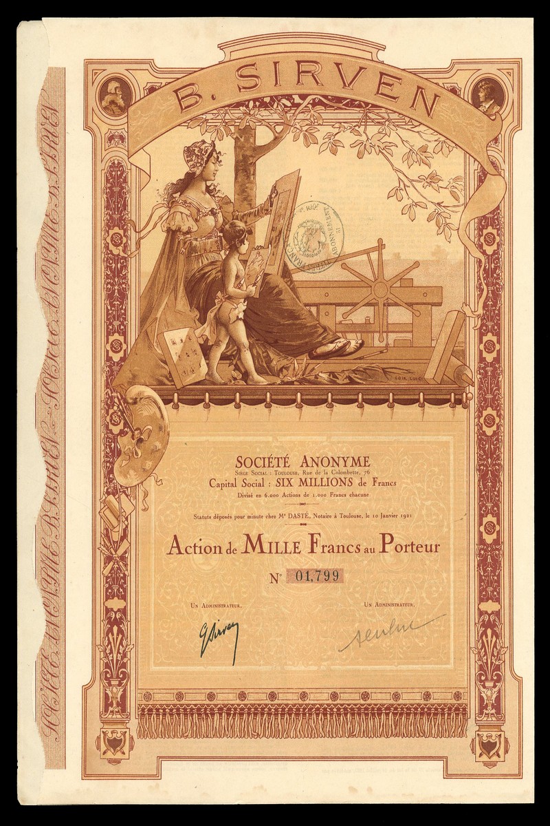 B. Sirven S.A., 1000 franc share, Toulouse 1921, fine and large vignette of 'art nouveau' scene of woman and boy admiring a picture, by the artist Luigi Loir (1845-1916), with his printed signature, small vignettes of Gutenberg and Sennefelder in top corners, printed in many shades of orange/brown, with coupons,, extremely fine.