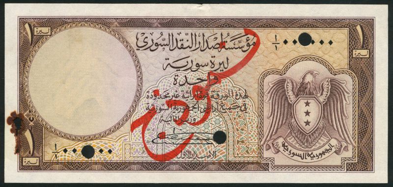 (x) Institut D'Emission de Syrie, specimen 1 livre, ND (1950's), black zero serial numbers, brown on multicolour underprint, arms at right