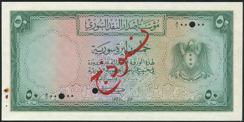 (x) Institut D'Emission de Syrie, specimen 50 livres, ND (1950's), green on multicolour underprint, arms at right