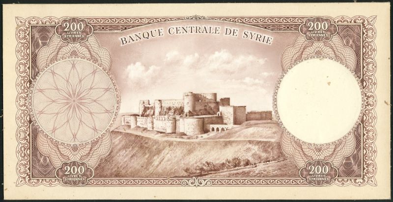 (†) Banque Centrale de Syrie, a reverse composite essay for a proposed issue of 200 livres, ND (ca 1958), brown, fortress at centre, value at each corner