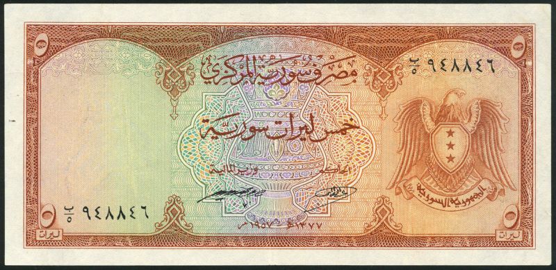 (x) Central Bank of Syria, 5 livres, 1957, serial number 948846 orange-brown on multicolour underprint, arms at right