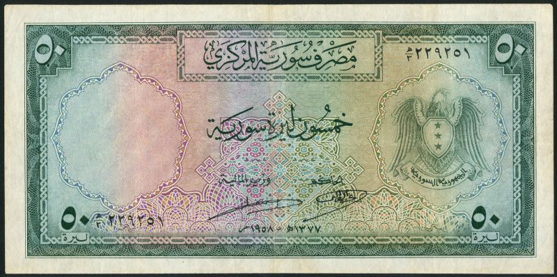(x) Central Bank of Syria, 50 livres, 1957, serial number 229251, green on multicolour underprint, arms at right