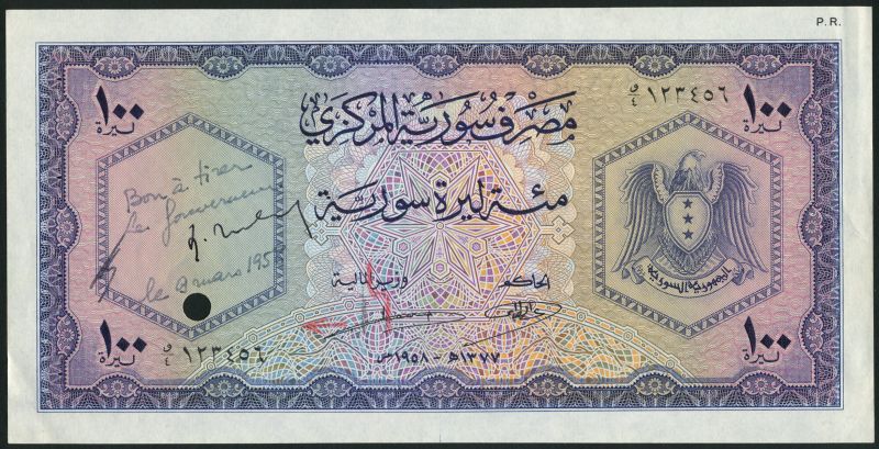 (†) Banque Centrale de Syrie, print pull for a 100 Livres, 1958, blue on multicoloured underprint, arms at right, reverse water wheel and aqueduct at Hama, one punch hole