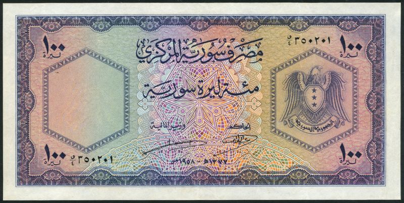 (x) Central Bank of Syria, 100 livres (2), 1957, serial number 350200/350201, purple-blue on multicolour underprint, arms at right