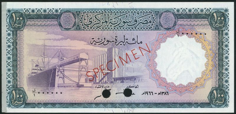 (†) Central Bank of Syria, colour trial 50 Livres, 1966, blue and purple, man driving combine harvester at left, reverse blue, fortress, one punch hole; colour trial 100 Livres, 1966, green and purple, port installation at left, reverse olive-brown, dam at centre, two punch holes, both zero serial numbers, both overprinted SPECIMEN in red on obverse and reverse