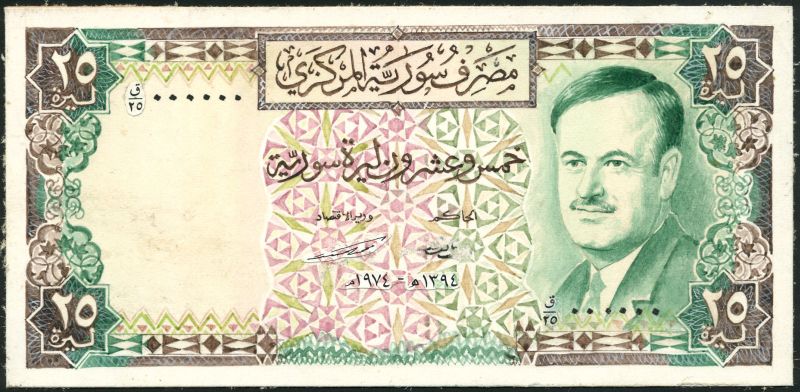 (†) Central Bank of Syria, an obverse and reverse composite essay for a 25 Syrian pounds, 1974/1971, zero serial numbers, lilac and green, General Hafez el Assad at right, value at each corner, reverse brown and pink, classical relief, value at each corner