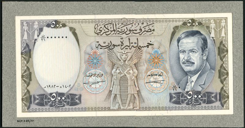 (†) Central Bank of Syria, partially hand executed obverse essay for 500 pounds, 1982, zero serial numbers, brown, dark blue and multicoloured, Assad at right, Ugarit Motifs at centre, value at each corner