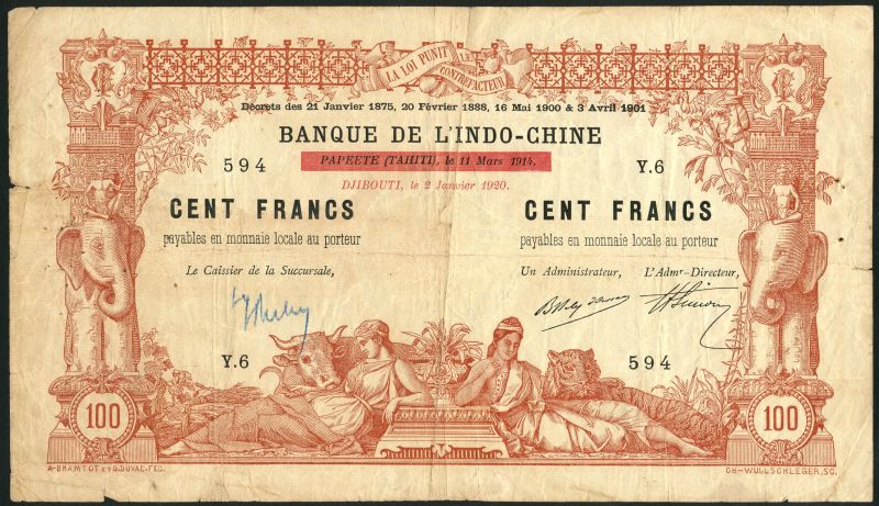Banque de l'Indo-Chine, Djibouti (French Somaliland), 100 francs, 2 January 1920, serial number Y.6 594, dark and light brown, allegorical figures low centre, elephant at left and right, D'Oissell and Simon signatures, manuscript signature at left, issued on a 100 francs of Tahiti dated 1914