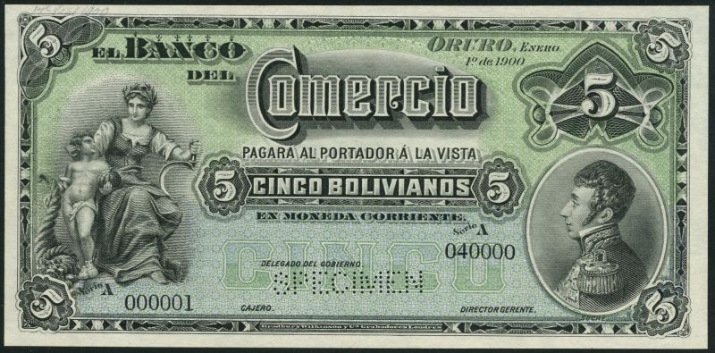 (†) El Banco del Commercio, Bolivia, specimen 1 boliviano, Oruro, 1 January 1900, serial number 000001-30000, blue and pink, miners at left, Bolivar at right, reverse blue, arms at centre, also a specimen 5 bolivianos, 1 January 1900, serial number 000001-040000, green and pale blue, maiden and child at left, Bolivar at right, reverse green, arms at centre