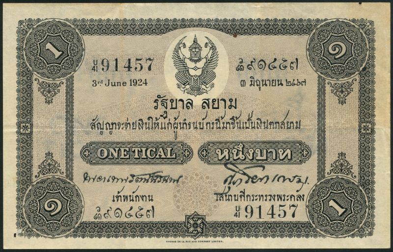 Government of Siam, 1 tical, 3 June 1924, serial; number U/41 91457, dark and light grey, Garuda bird top centre, value at each corner, signature 9