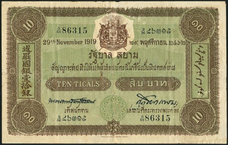 Government of Siam, 10 ticals, 29 November 1919, serial number B/64 86315, green and brown, arms top centre, value at centre and at each corner, signature 9