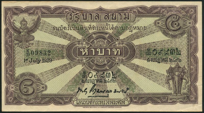 Government of Siam, 5 baht, 1 July 1929, prefix K/30, purple and pale green, Garuda bird top left, three headed elephant low right, signature 11, reverse violet and pale green, procession at centre in oval frame, value at left and right