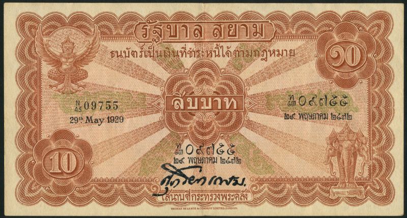 Government of Siam, 10 baht, 29 May 1929, prefix N/43, brown, pale pink and green, Garuda bird top left, three headed elephant low right, signature 10, reverse pink and brown, procession at centre in oval frame, value at left and right