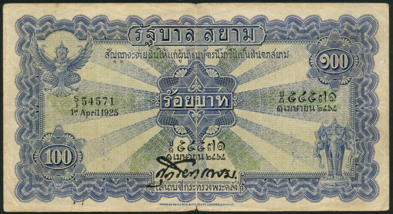 Government of Siam, 20 baht, 29 November 1926, prefix P/18, green and mauve and 100 baht, 1 April 1925, prefix S/1, blue and green, both Garuda bird top left, three headed elephant low right, signature 10