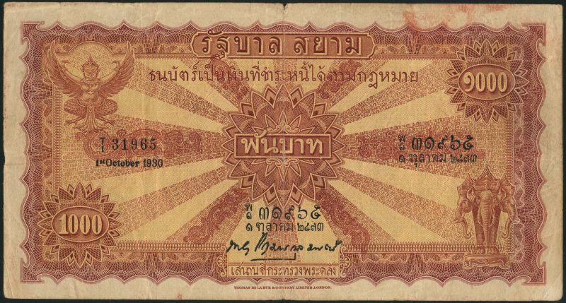 Government of Siam, 1000 baht, 1 October 1930, serial number T/1 31965, purple and pale orange, Garuda bird top left, three headed elephant low right, signature 11