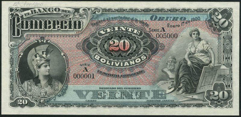 (†) El Banco del Commercio, Bolivia, specimen 20 bolivianos, Sucre, 1 January 1894, serial numbers A 000001-A 005000, pale blue and lilac, head of Minerva at left (as used on the Hong Kong and Shanghai Banking Corporation $1 of the period), maiden with allegorical symbols of the Arts at right, reverse, pale green and lilac, arms at centre, value at left and right