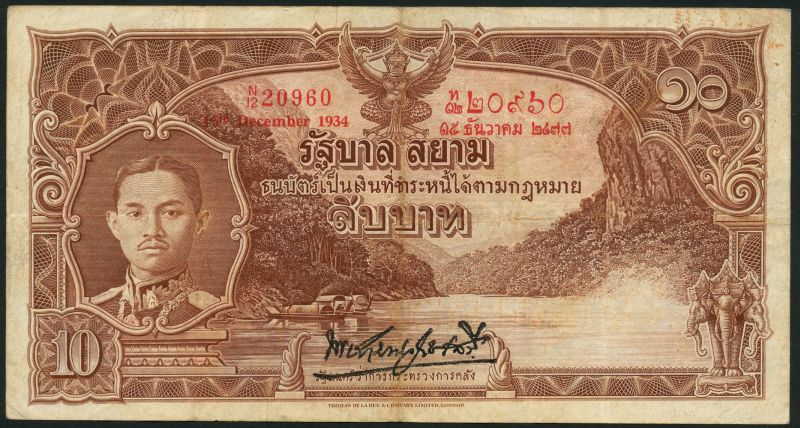 Government of Siam, 5 baht, 13 January 1935, red prefix K/13, violet and multicoloured, Rama VII at left, the Emerald Buddha temple at centre, Garuda top left, signature 14, also 10 baht, 15 December 1934, red prefix N/12, brown, Rama VII at left, river right centre, Garuda top centre, three headed elephant low right, signature 14