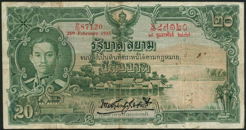 Government of Siam, 20 baht, 25 February 1935, red prefix P/10, green and multicoloured, King Rama VII at left, river and village at centre, Garuda above, three headed elephant low right, signature 14