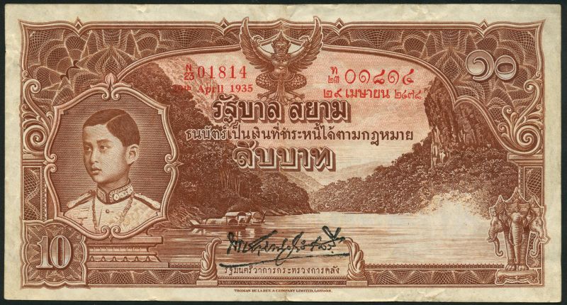 Government of Siam, 1 baht, 1 May 1937, red prefix E/8, blue and multicoloured, King Rama VIII at left, Royal barge at centre, Garuda above, signature 15, also 10 baht, 29 April 1935, red prefix N/23, brown, river and Rama VIII, signature 14, also 20 baht, 29 May 1936, red prefix P/16, green, village on river at centre, signature 15