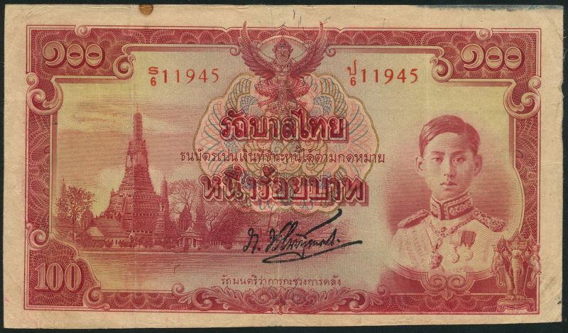 Government of Thailand, 50 satang, green and pink, signature 17, 1 baht, brown and pink, signature 17, 20 baht, blue, signature 17, 100 baht, red, signature 17, all Rama VIII facing at right