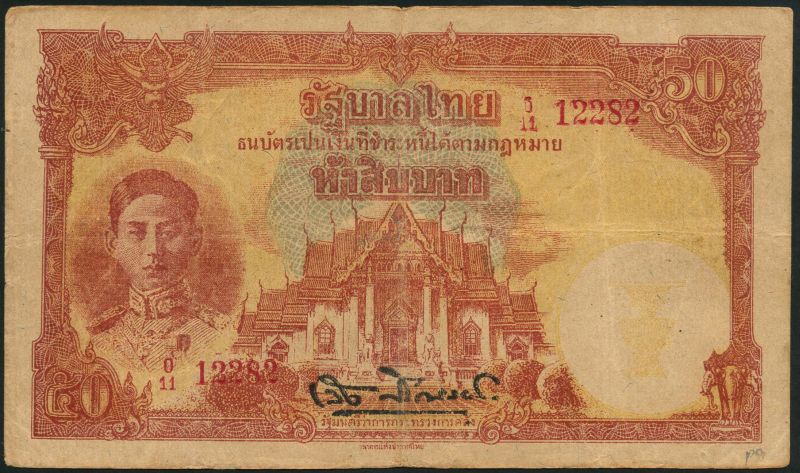 Government of Thailand, 1 baht, ND (1945), blue and pink, 50 baht, ND (1945), red, both Rama VIII at left, 10 baht, ND (1942), purple and pale green, no signatures or serial numbers, also another example with 50 satang overprint, ND (1946), purple and pale green, signaure 22, gateway at left, Rama VIII at right