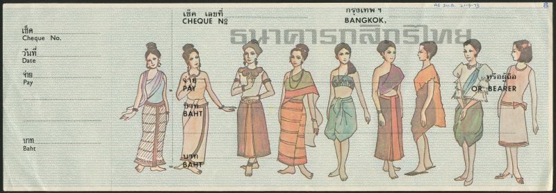 (†) The Thai Farmers Bank Limited, a proof cheque, ND (1973), multicoloured on blue underprint, nine women in wearing various different fashions across face, The Thai Farmers Bank Limited repeated in underprint,
