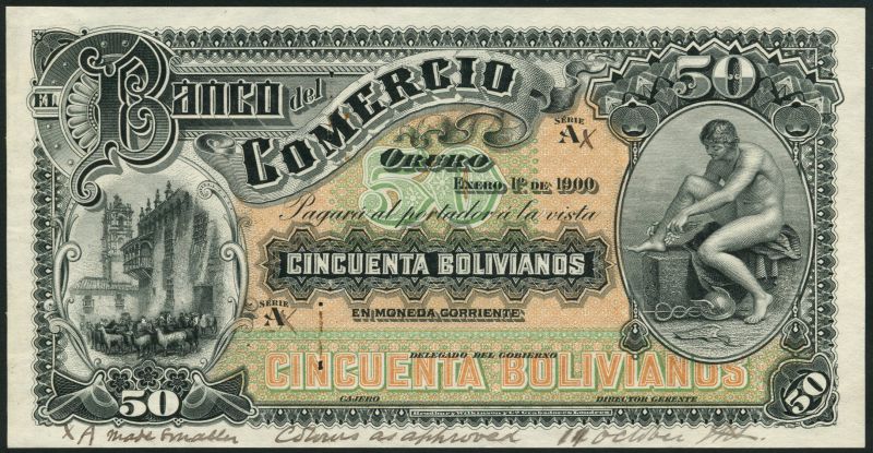 (†) El Banco del Commercio, Bolivia, specimen 50 bolivianos, Sucre, 1 January 1894, black, pale pink and green, llamas in a Potosi street at left, Mercury tying on his wings at right, value in green top centre, reverse, brown and pale green, arms at centre, value at left and right
