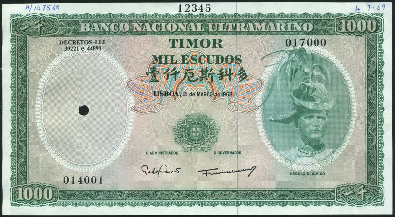 (†) Banco Nacional Ultramarino, Timor, specimen 500 escudos (2), 25 April 1963, serial number 023201-026000,026001-029000, dark brown and multicoloured, Aleixo at right, also a partial printing of a 500 escudos, also specimen 1000 escudos (2), 21 March 1968, serial number 012001-014000,014001-017000, green and multicoloured, Aleixo at right, arms at centre